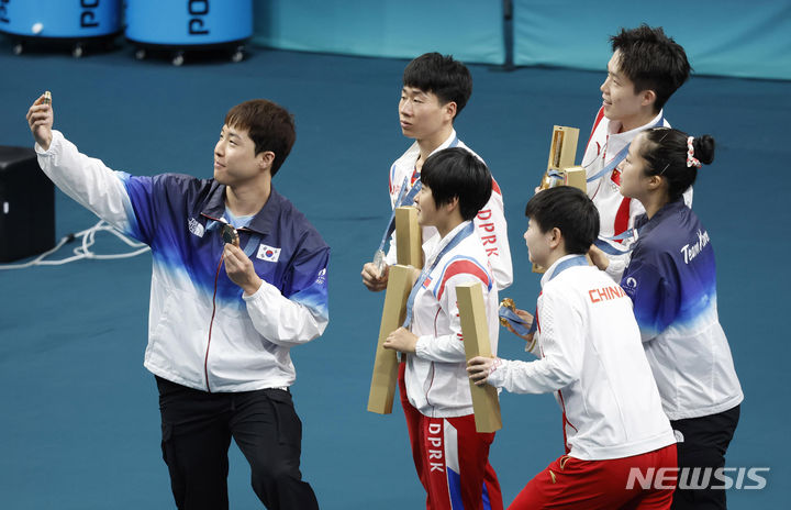 卓球混合ダブルス授賞式で南北が記念ショット パリ五輪(4/16)