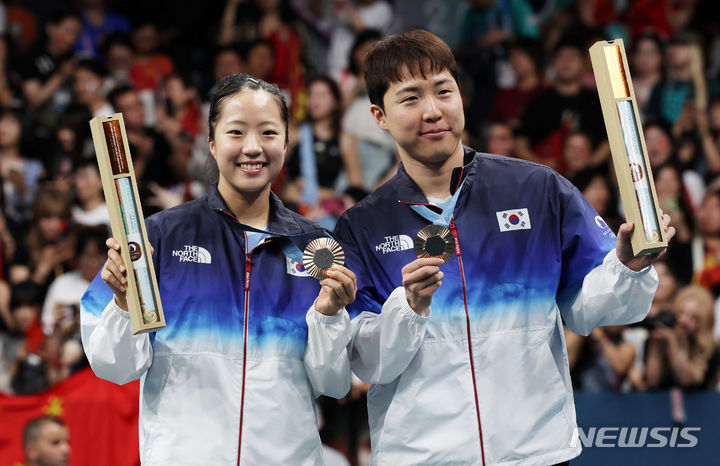 卓球混合ダブルス授賞式で南北が記念ショット パリ五輪(5/16)