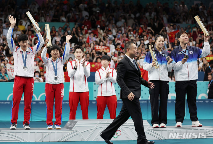 卓球混合ダブルス授賞式で南北が記念ショット パリ五輪(8/16)