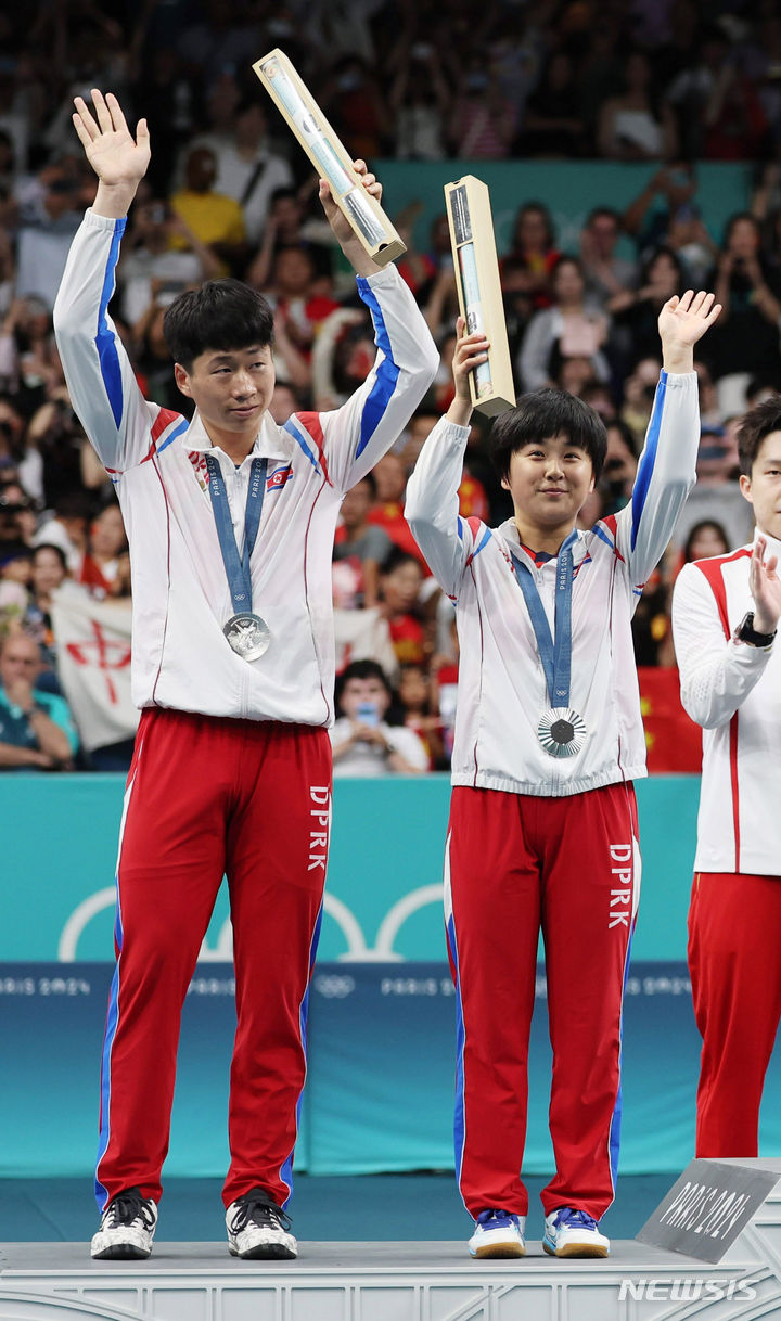 卓球混合ダブルス授賞式で南北が記念ショット パリ五輪(9/16)