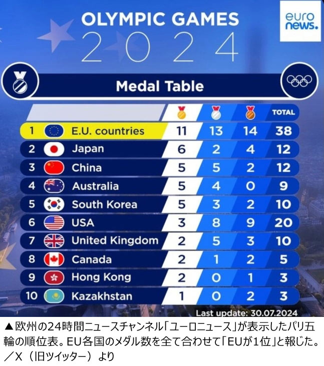 ユーロニュース「EUがメダル38個で1位」 まさかの計算法にネット騒然 パリ五輪(2/2)
