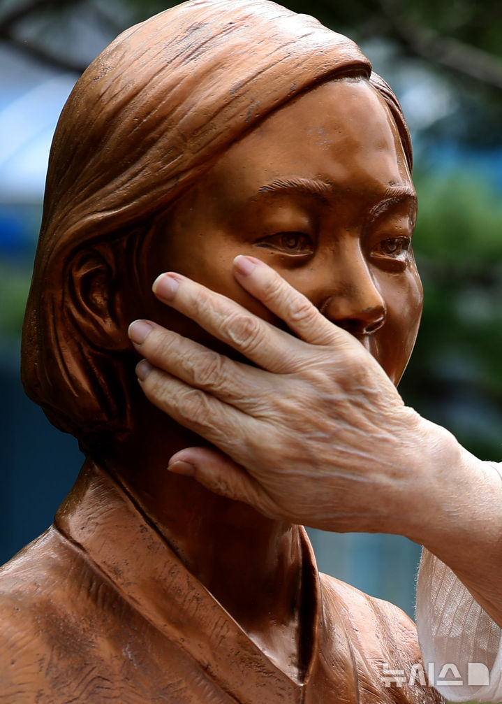 「平和の少女像」を撫でる李容洙ハルモニ(2/10)