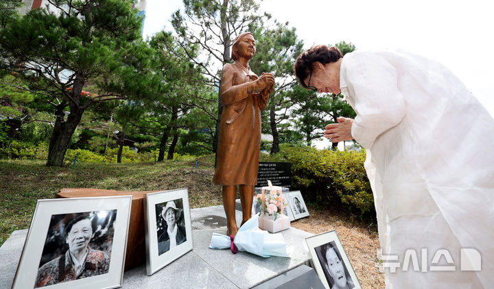「平和の少女像」を撫でる李容洙ハルモニ(7/10)
