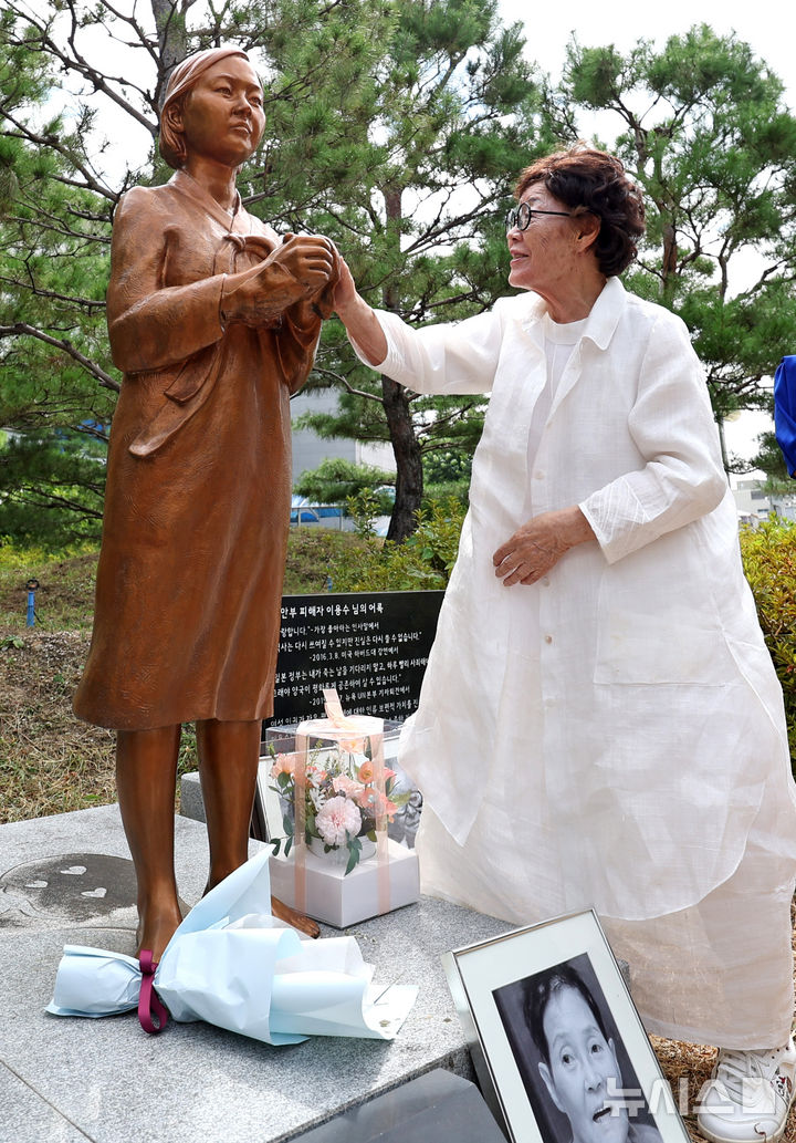 「平和の少女像」を撫でる李容洙ハルモニ(10/10)