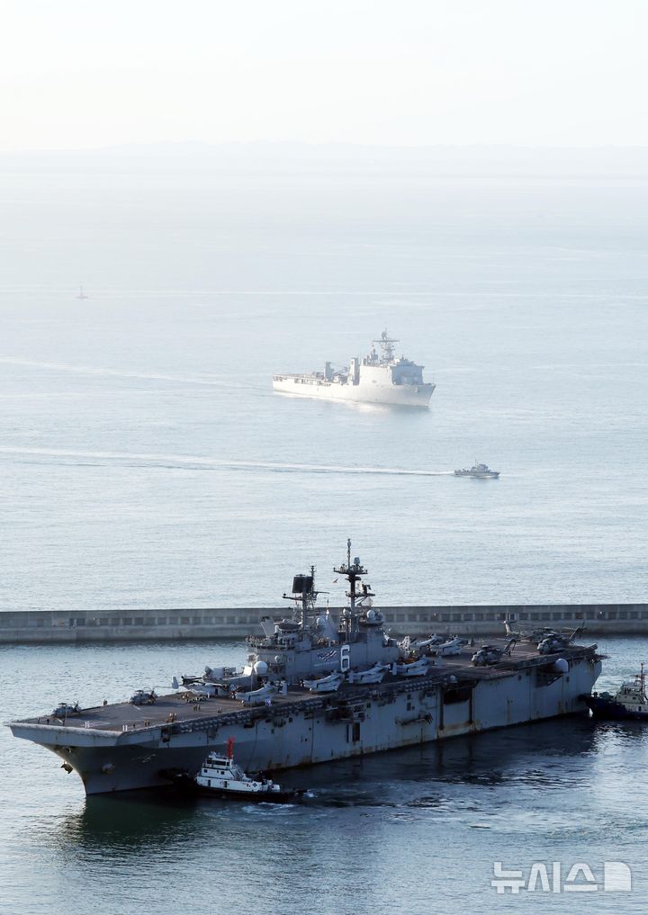 米海軍の強襲揚陸艦アメリカ&ドック型揚陸艦コムストックが釜山に寄港(3/7)
