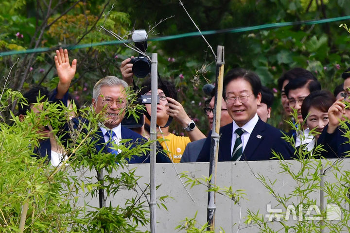 支持者に手を振る文前大統領と李在明・共に民主代表 /慶尚南道(4/7)