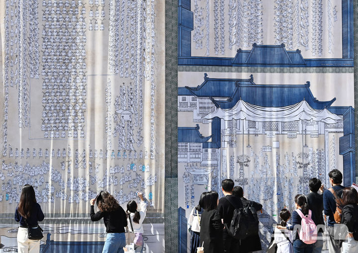 大きな「華城行幸図」に色を塗る子どもたち(11/13)