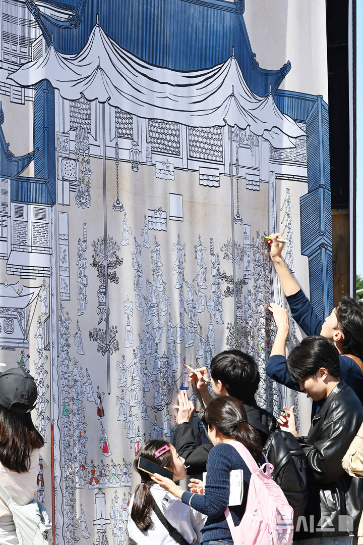 大きな「華城行幸図」に色を塗る子どもたち(3/13)