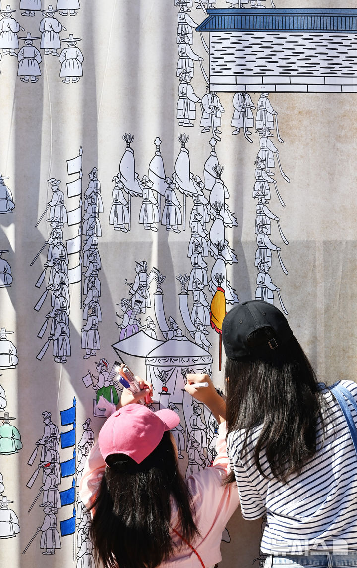 大きな「華城行幸図」に色を塗る子どもたち(10/13)