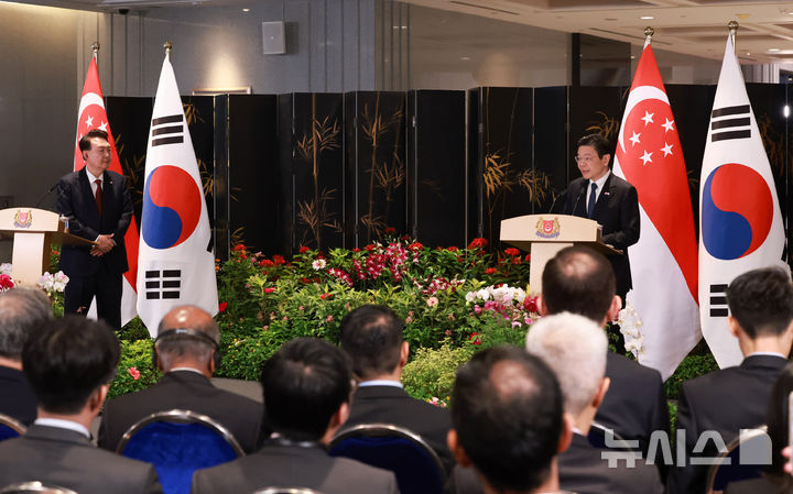 共同メディア発表を終えた韓国・シンガポール首脳(4/10)