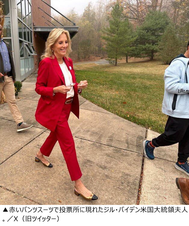 失敗コーデ? 投票所に赤いパンツスーツ姿で現れたジル夫人が話題に 米大統領選(2/2)