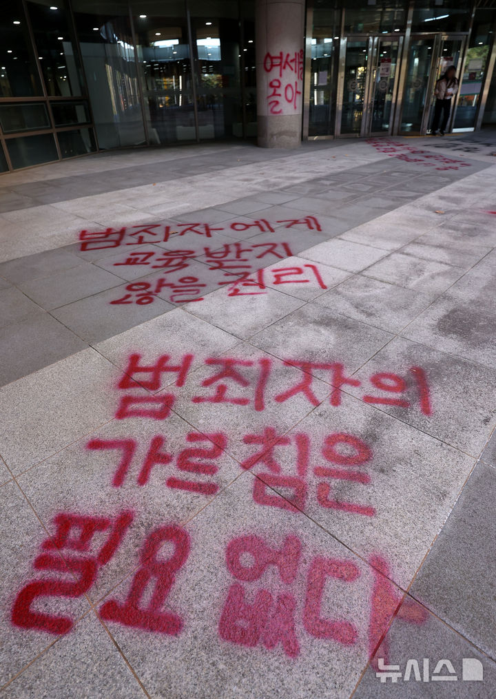 ソウル女子大の学生、性犯罪の教授を糾弾して「ラッカー落書きデモ」(3/15)