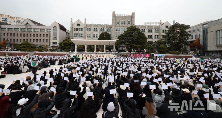 男女共学転換への反対意見を主張する同徳女子大の学生たち(2/10)