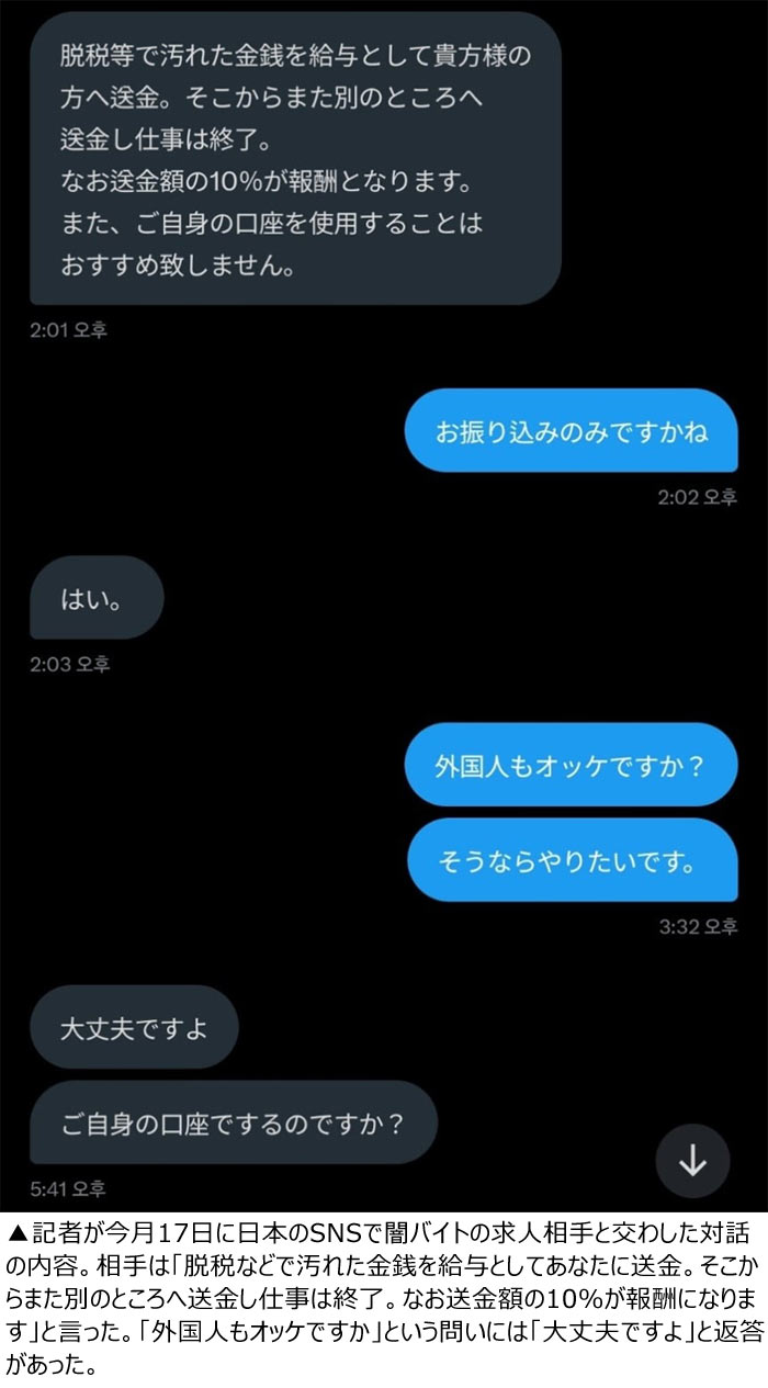 高額報酬をえさに「闇バイト」、恐怖におののく日本…韓国人記者が求人担当に接触してみると(2/2)