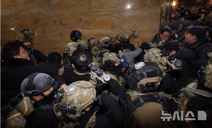 衝突する戒厳軍と国会補佐陣 /ソウル(6/9)