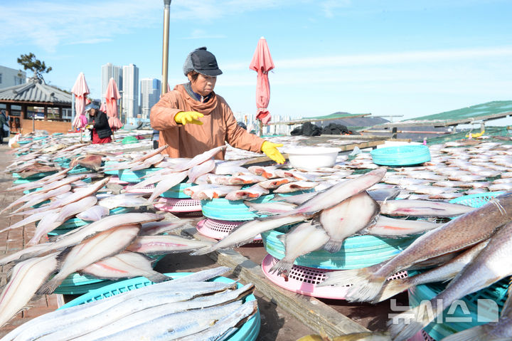 カレイの乾燥作業を行う漁業関係者(8/10)