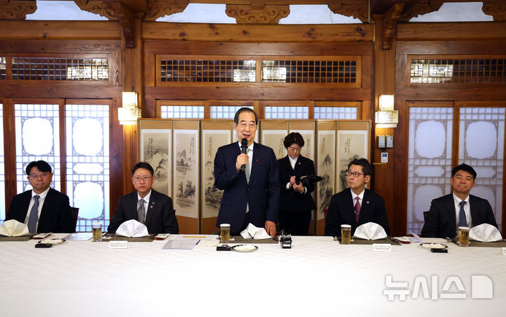 駐韓日本商工会議所の昼食懇談会で発言する韓悳洙・大統領権限代行(11/12)