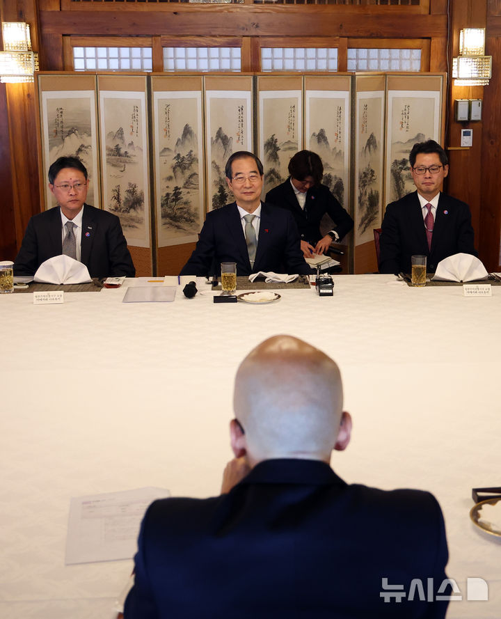 駐韓日本商工会議所の昼食懇談会で発言する韓悳洙・大統領権限代行(4/12)