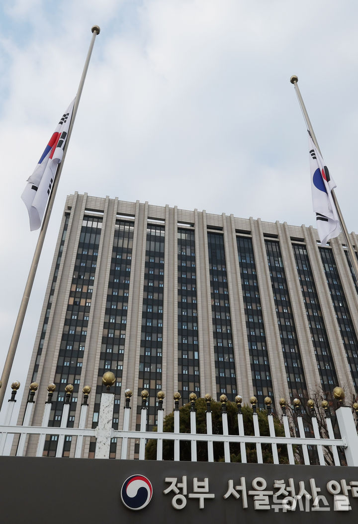チェジュ航空機事故「国家哀悼期間」 半旗並ぶ韓国政府ソウル庁舎(2/5)