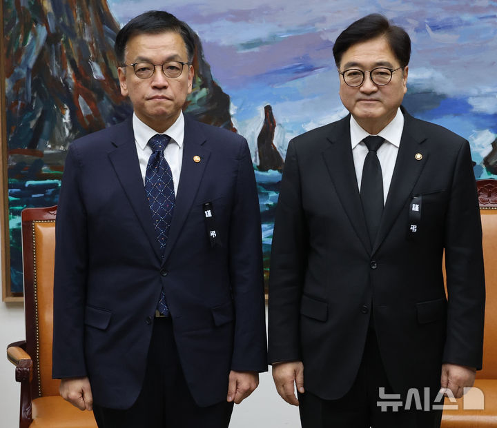 記念撮影をする崔相穆大統領権限代行と禹元植国会議長(4/8)