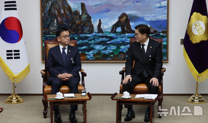 記念撮影をする崔相穆大統領権限代行と禹元植国会議長(7/8)
