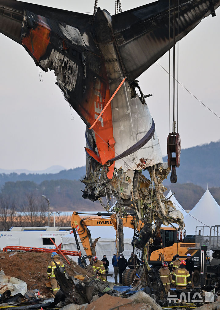 惨事から六日…クレーンで吊り上げられた事故機の尾翼部分(2/12)