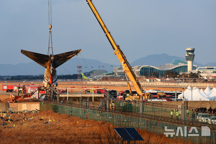 惨事から六日…クレーンで吊り上げられた事故機の尾翼部分(12/12)