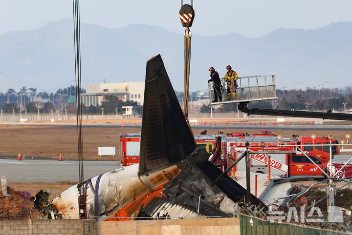 惨事から六日…クレーンで吊り上げられた事故機の尾翼部分(5/12)