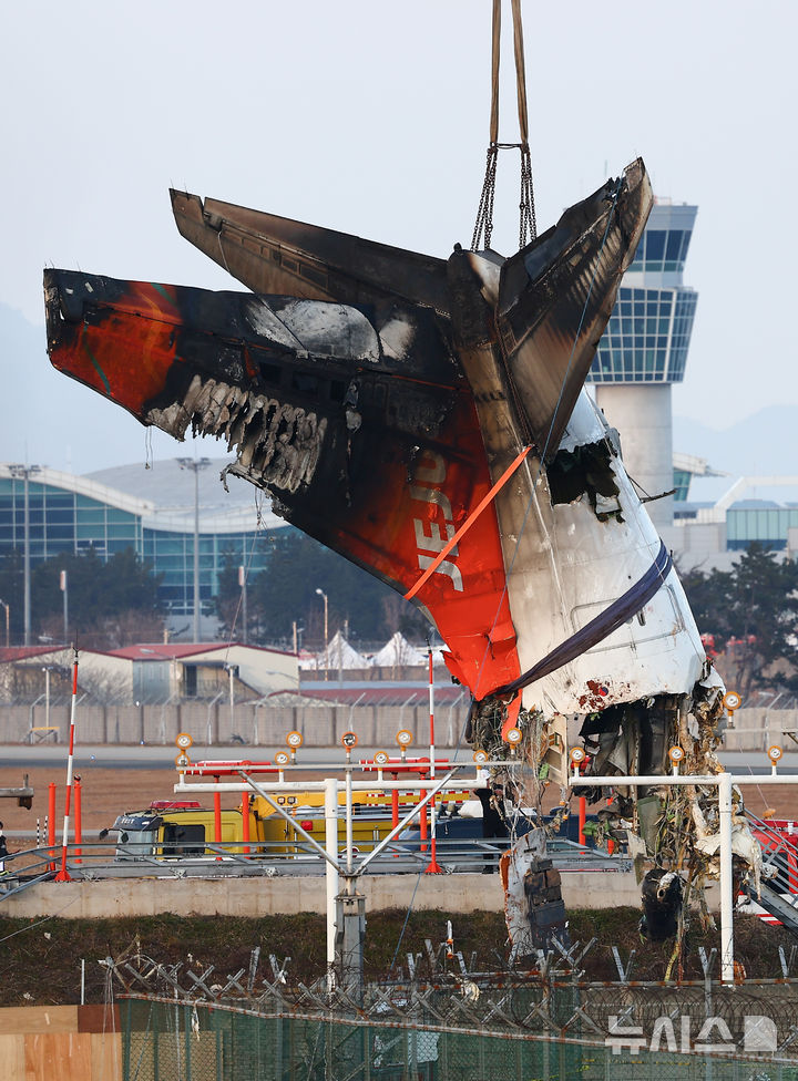 惨事から六日…クレーンで吊り上げられた事故機の尾翼部分(7/12)