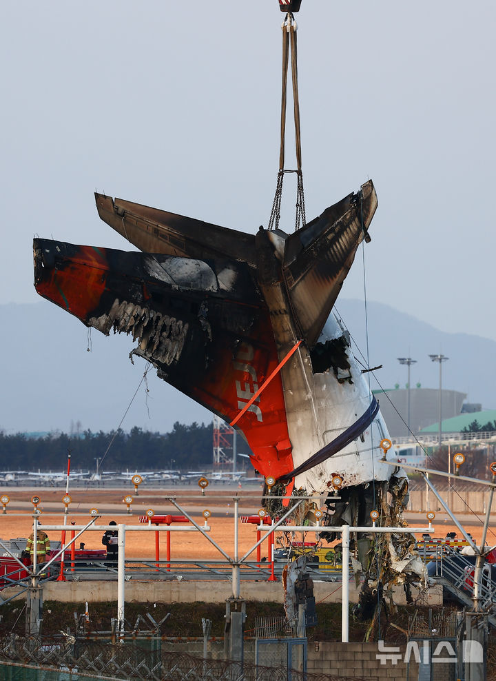 惨事から六日…クレーンで吊り上げられた事故機の尾翼部分(8/12)