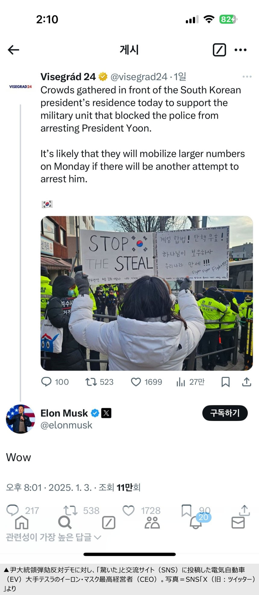 「戒厳合法! 弾劾無効!」「Stop the Steal」と訴える尹大統領弾劾反対デモの様子にイーロン・マスク氏「Wow」(2/2)