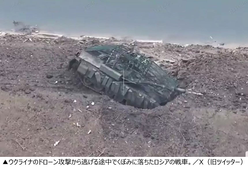ウクライナ軍のドローンから逃げるロシア最新の主力戦車T-90M、くぼみに落ちる(2/2)