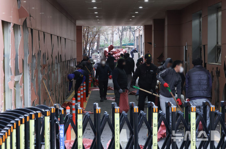 破壊されたソウル西部地裁で清掃作業開始(10/17)