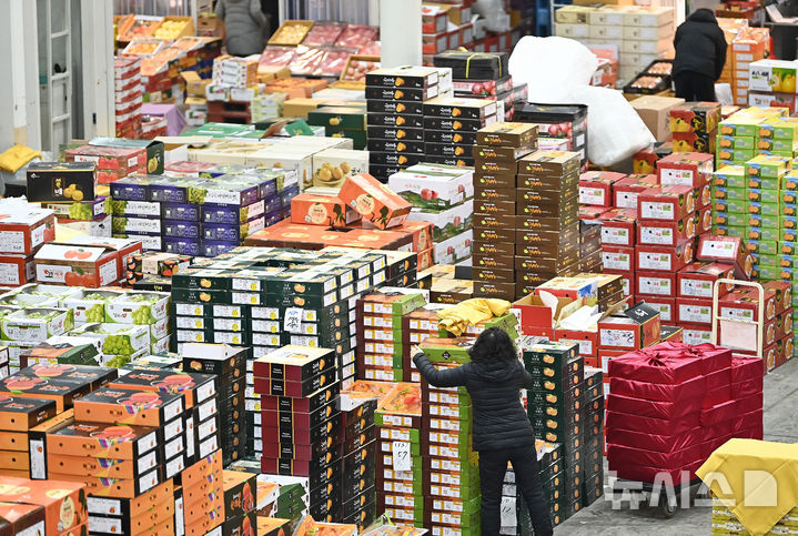 旧正月を前に山積みになった果物詰め合わせセット /京畿道(4/8)