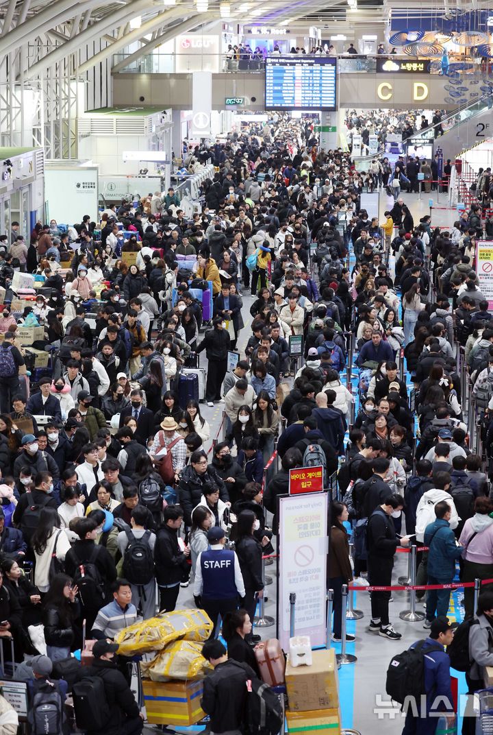 旧正月の連休を海外で過ごす旅行客が集まる金海国際空港(3/10)