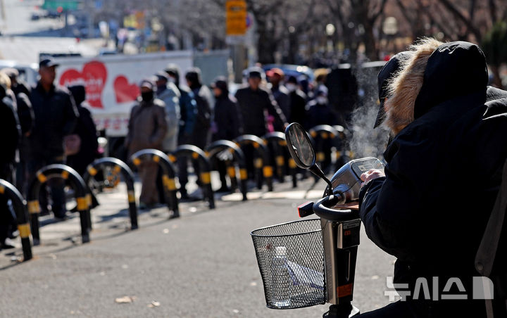 強い寒さの中、無料給食の列に並ぶ高齢者(3/7)