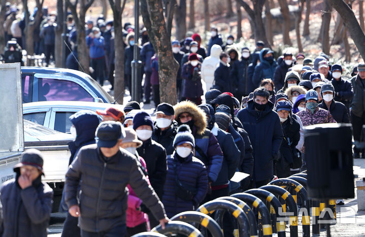 強い寒さの中、無料給食の列に並ぶ高齢者(6/7)