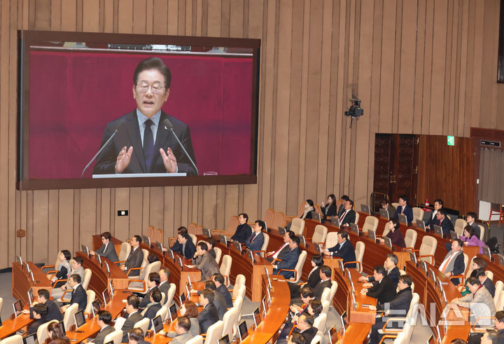 交渉団体代表演説を行う李在明・共に民主党代表 /韓国国会(3/12)