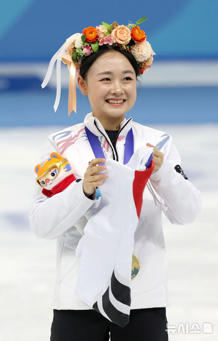 フィギュア:金彩然 喜びの金メダル=冬季アジア大会(16/18)