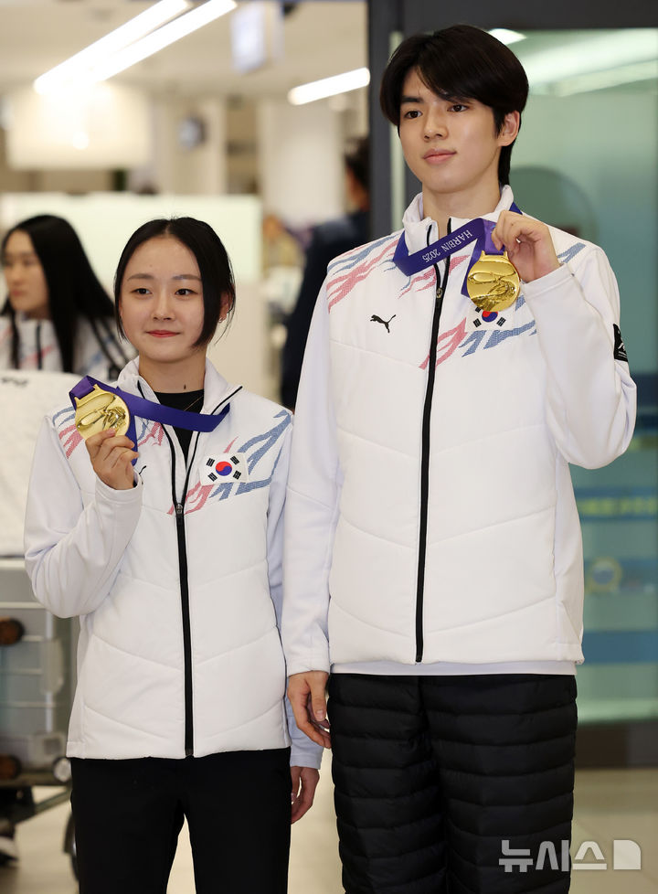 フィギュア:金メダルを披露する車俊煥と金彩然=冬季アジア大会(2/11)