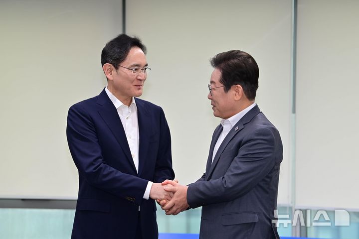 握手する李在明・共に民主党代表と李在鎔サムスン電子会長(2/17)