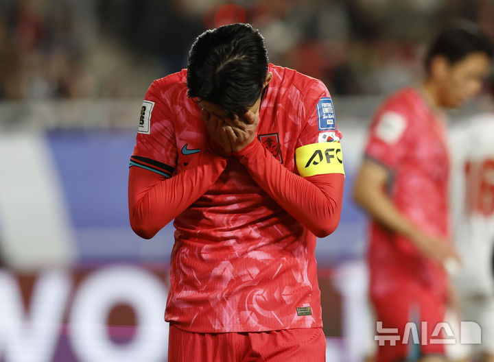 サッカー:引き分けて顔を覆う韓国代表ソン・フンミン=W杯アジア最終予選(6/8)