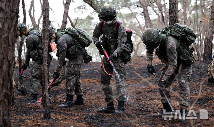 韓国大規模山火事 残り火の鎮圧支援作戦に当たる兵士たち /慶尚北道(1/10)