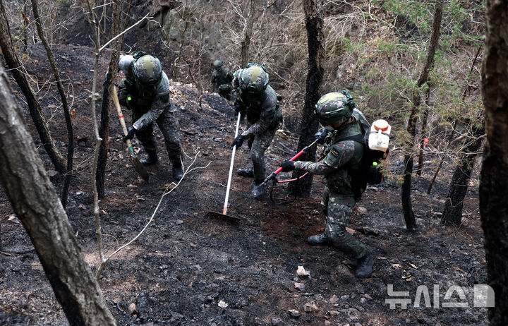 韓国大規模山火事 残り火の鎮圧支援作戦に当たる兵士たち /慶尚北道(5/10)