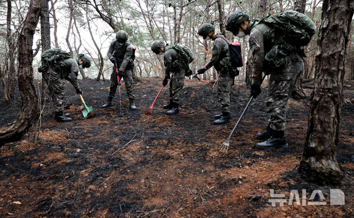 韓国大規模山火事 残り火の鎮圧支援作戦に当たる兵士たち /慶尚北道(6/10)