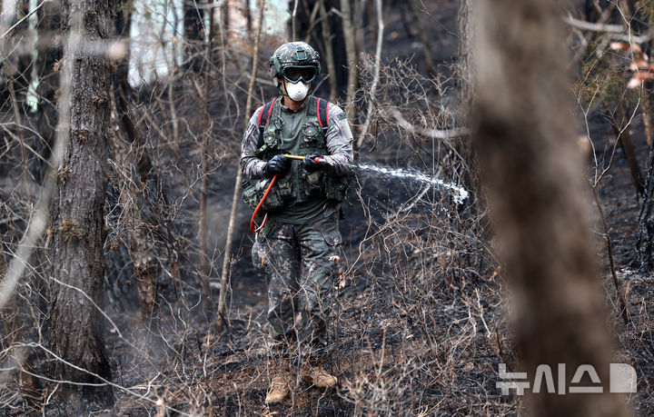 韓国大規模山火事 残り火の鎮圧支援作戦に当たる兵士たち /慶尚北道(7/10)
