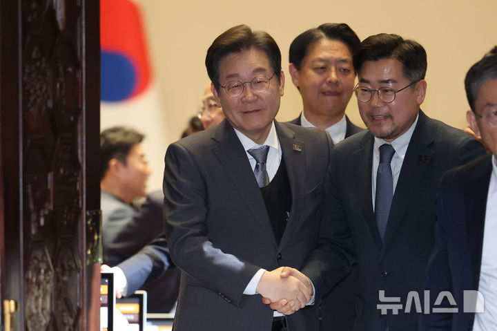 本会議場を出つつ握手する最大野党代表と院内代表(3/12)