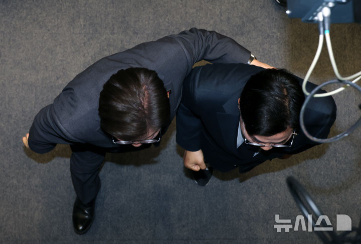 本会議場を出つつ握手する最大野党代表と院内代表(7/12)