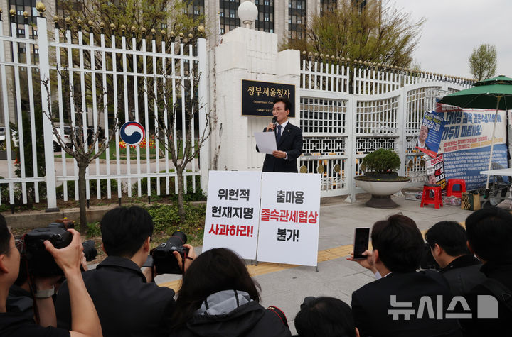 政府ソウル庁舎前で記者会見する金民錫・共に民主党最高委員(3/9)