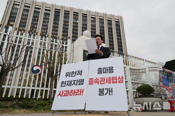 政府ソウル庁舎前で記者会見する金民錫・共に民主党最高委員(5/9)